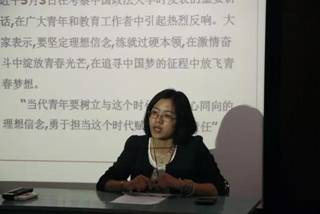 会上,袁老师首先传达了会议精神,说明了学习的目的和意义,随后,她带领大家学习了习近平总书记在座谈会上的重要讲话精神内容。习近平总书记5月3日在考察中国政法大学时发表的重要讲话在广大青年和教育工作者中引起热烈反响。大家表示,要坚定理想信念,练就过硬本领,在激情奋斗中绽放青春光芒,在追寻中国梦的征程中放飞青春梦想。