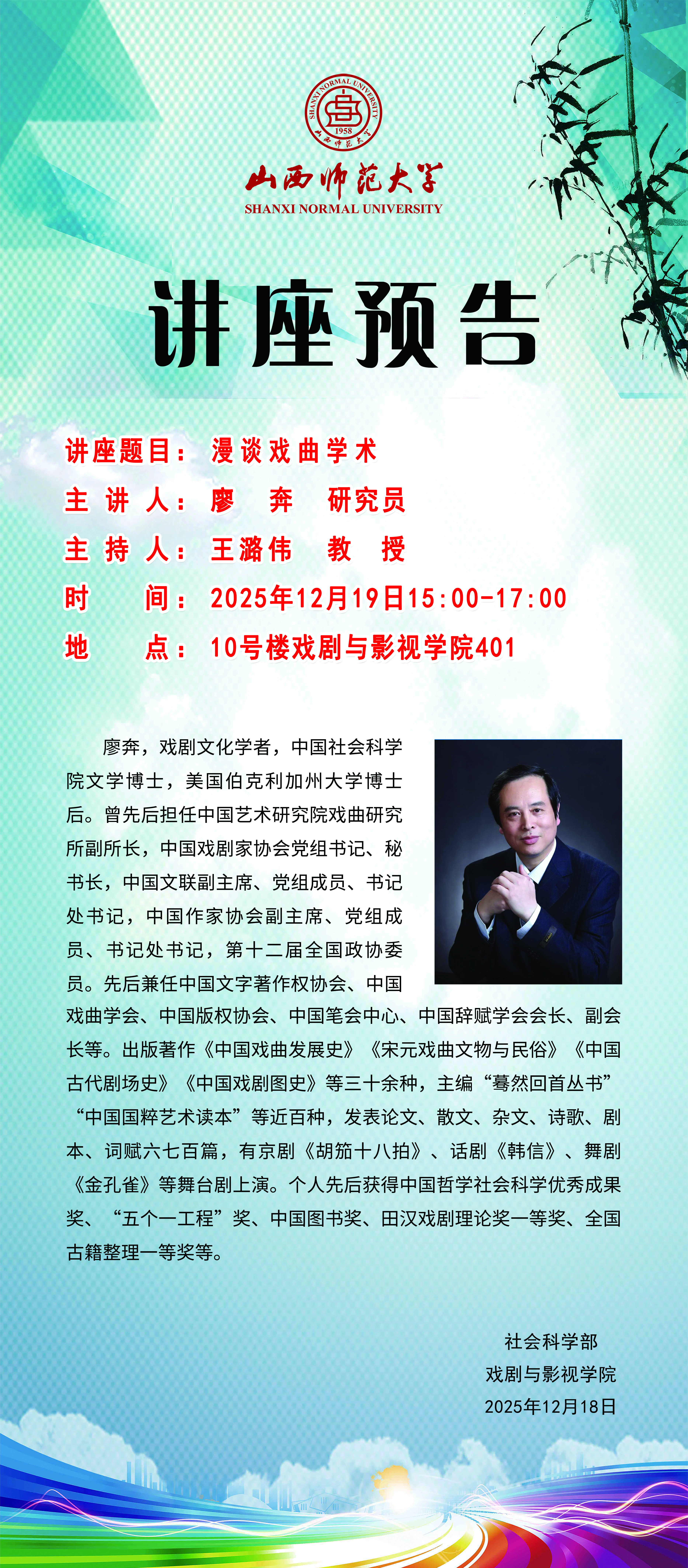 公司拟于12月19日(周五)下午15:00-17:00在南区10号楼401会议室举办《漫谈戏曲艺术》讲座,主讲人为廖奔研究员,本次讲座由王潞伟教授主持。