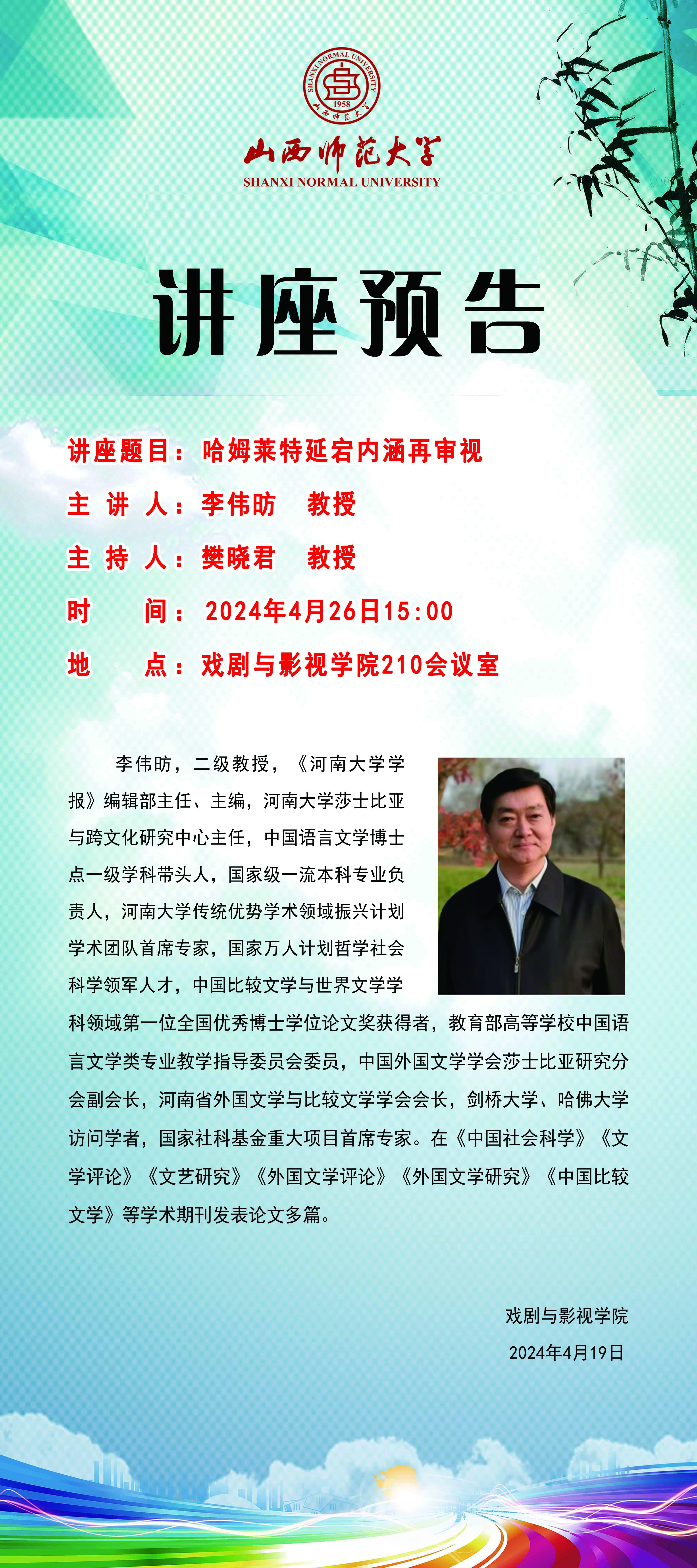 公司拟于2024年4月26日15:00在210会议室举办《哈姆莱特延宕内涵再审视》讲座,主讲人为河南大学李伟昉教授。