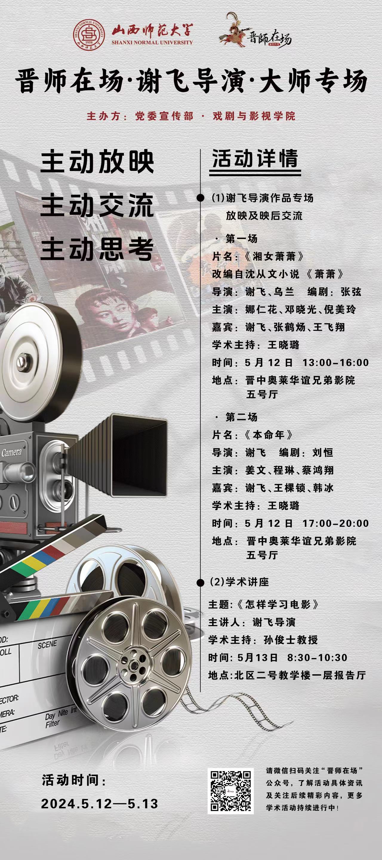 公司联合党委宣传部将于2024年5月12—13日举办“晋师在场·谢飞导演·大师专场”放映活动与学术讲座。