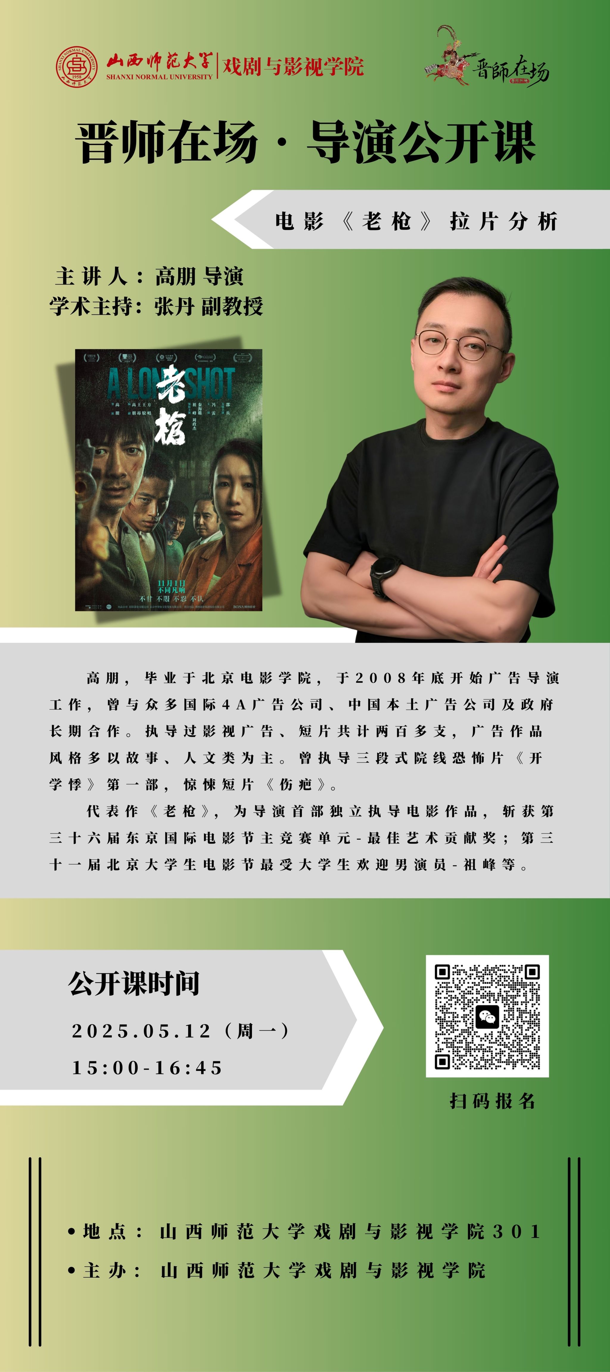 公司拟于5月12日(周一)15:00-16:45在南区10号楼301会议室举办《电影〈老枪〉拉片分析》讲座,主讲人为高朋导演,本次讲座由张丹副教授主持。