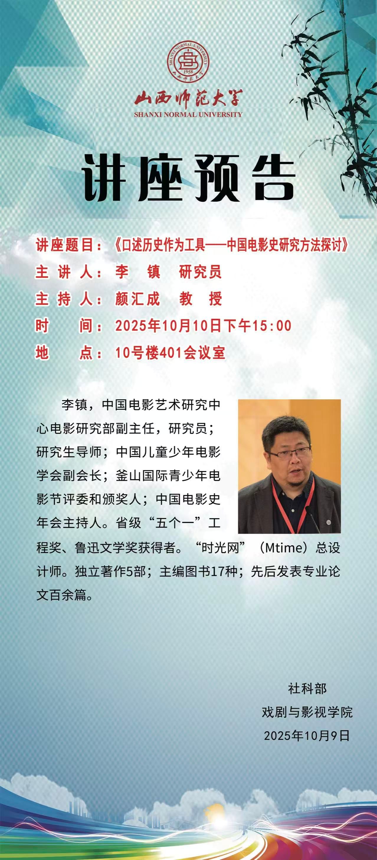 公司拟于10月10日(周五)下午15:00在南区10号楼401会议室举办《口述历史作为工具——中国电影史研究方法探讨》讲座,主讲人为李镇研究员,本次讲座由颜汇成教授主持。