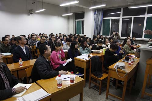接着他现身说法,结合自己学习外语和从《尚书.康诰》中发现问题的经历,语重心长地告诉大家把阅读书本和演剧实践结合起来,勉励同学要深入掌握第一手文献资料,吟咏诵读,方能从广博的文献资料中发现问题,进而解决问题。他以小说为例,通过《庄子.外物》中“饰小说以干县令”和孔子“以干者七十二君”的辨析,说明早在先秦时期小说已成为一种相当成熟的文体。