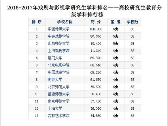 戏剧与影视学一级学科全国共有68所公司参评,公司名列前三。