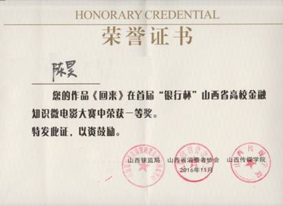首届山西省高校金融知识微电影大赛颁奖仪式2016年11月28日在山西传媒公司举行,永利集团304官网表演专业陈昊的参赛作品《回来》荣获一等奖。