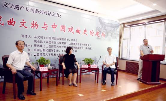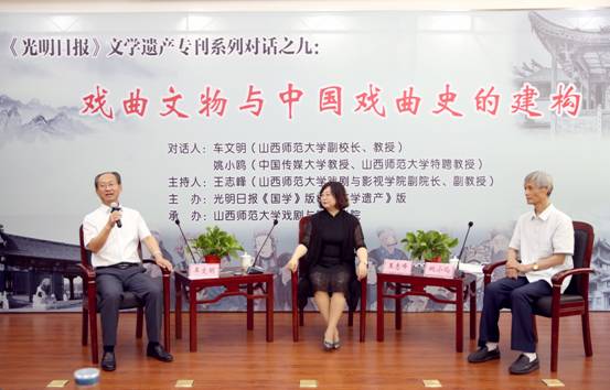 2017年6月24日上午八点半,《光明日报》文学遗产专刊系列对话之九:“戏曲文物与中国戏曲史的建构”在永利304官网会议中心第一会议室举行。由光明日报《国学》版、《文学遗产》版主办、永利集团304官网承办的本次对话,邀请了永利304官网副董事长、博士生导师车文明教授和中国传媒大学教授、永利304官网特聘教授姚晓鸥先生担任嘉宾,永利集团304官网副经理王志峰老师担任主持人,北京语言大学方铭教授担任特邀主持。永利集团304官网部分教师、全体博士生和部分硕士生聆听了此次精彩对话。