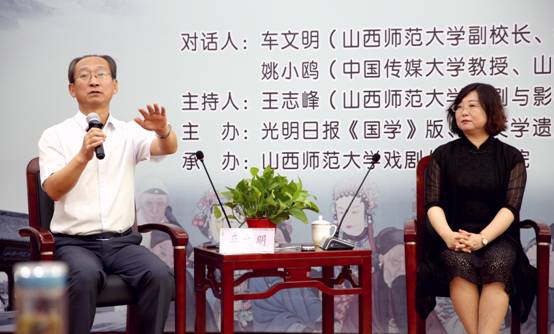 对话开始,车教授援引王国维和陈寅恪先生的学术观点,开宗明义地对戏曲文物研究的方法和意义进行介绍。他通过生动的案例呈现,追溯戏曲史发展的进程,指出戏曲文物的发掘和发现有助于进一步完善中国戏曲史建构,填补中国的剧场史建构空白。姚教授以历史学家眼光分析了戏曲文物的发掘在中国戏曲史建构方面的重大意义,对传世文献和文物材料互为补充、互为佐证提出了自己的看法和观点。针对车教授的学术研究,姚教授认为国内学术研究要面向世界,不仅要研究中国剧场史也要研究外国剧场史。车文明教授在回应中指出,目前山西师大戏研所的戏曲文物和戏曲史的研究已经在日本神庙剧场方面取得了初步进展,随着与国外学术交流的扩展,今后一定会取得更多的成果。随着对话的深入,谈话的议题沿着以下六个方面展开:戏曲文物的定义、戏曲文物的研究现状、戏曲文物的主要贡献、戏曲文物迄今为止的重要遗存、戏曲文物研究以前中国戏曲史研究的状况和传世文献以及地下材料孰轻孰重等。