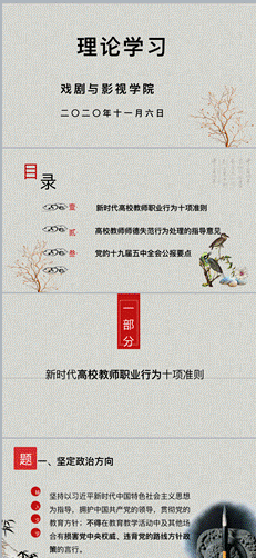 会议首先由孔美艳老师带领大家学习了《新时期高校教职工职业行为十项准则》《高校教师师德失范行为处理的指导意见 》及《党的十九届五中全会公报》等文件的相关内容。前者要求高校教师要坚守十项基本准则,包括坚定政治方向、自觉爱国守法、传播优秀文化、潜心教书育人、关心爱护员工、坚持言行雅正、遵守学术规范、秉持公平诚信、秉持公平诚信、坚守廉洁自律、积极奉献社会;后者分别从教师本人、院系领导、校领导、制度制订、落实,渎职追责等角度明确了高校教师师德失范相关人员的责任和处罚;关于第三个文件,孔老师从“一个重要判断”“决胜建成小康社会所取得的10方面决定性成就”“我国发展环境面临的深刻负责变化(包括国际国内的机遇和挑战)”“到2035年要实现的9方面远景目标”“‘十四五’时期经济社会发展的6方面主要目标”“实现奋斗目标的12方面具体措施”几方面介绍了党的十九届五中全会的主要精神。
