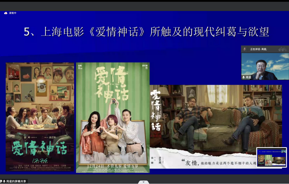 11月5日晚,永利集团304官网邀请北京师范大学艺术教育研究中心主任,北师大亚洲与华语电影研究中心主任,教育部高校戏剧与影视学类专业教学指导委员会主任,博士生导师——周星教授担任主讲人,为公司师生作以《艺术审美的感染力:当下中国电影地域文化与情感多样性》为题的线上讲座。本讲座由公司副经理、副教授、博士生导师王潞伟主持,公司副教授、硕士生导师张丹围绕讲座主题与周星教授展开交流。