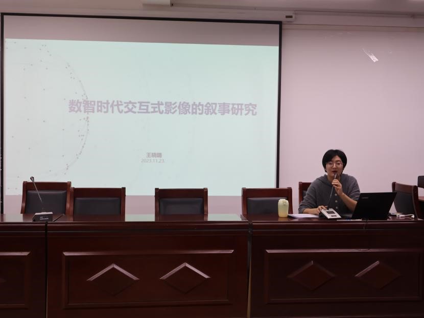 11月23日下午,公司在210会议室举办第七场“导师系列讲座”。本次讲座题目为“数智时代交互式影像的交互叙事研究”,由王晓璐博士主讲,王飞翔博士主持,全院硕博研究生及部分教师参与活动。