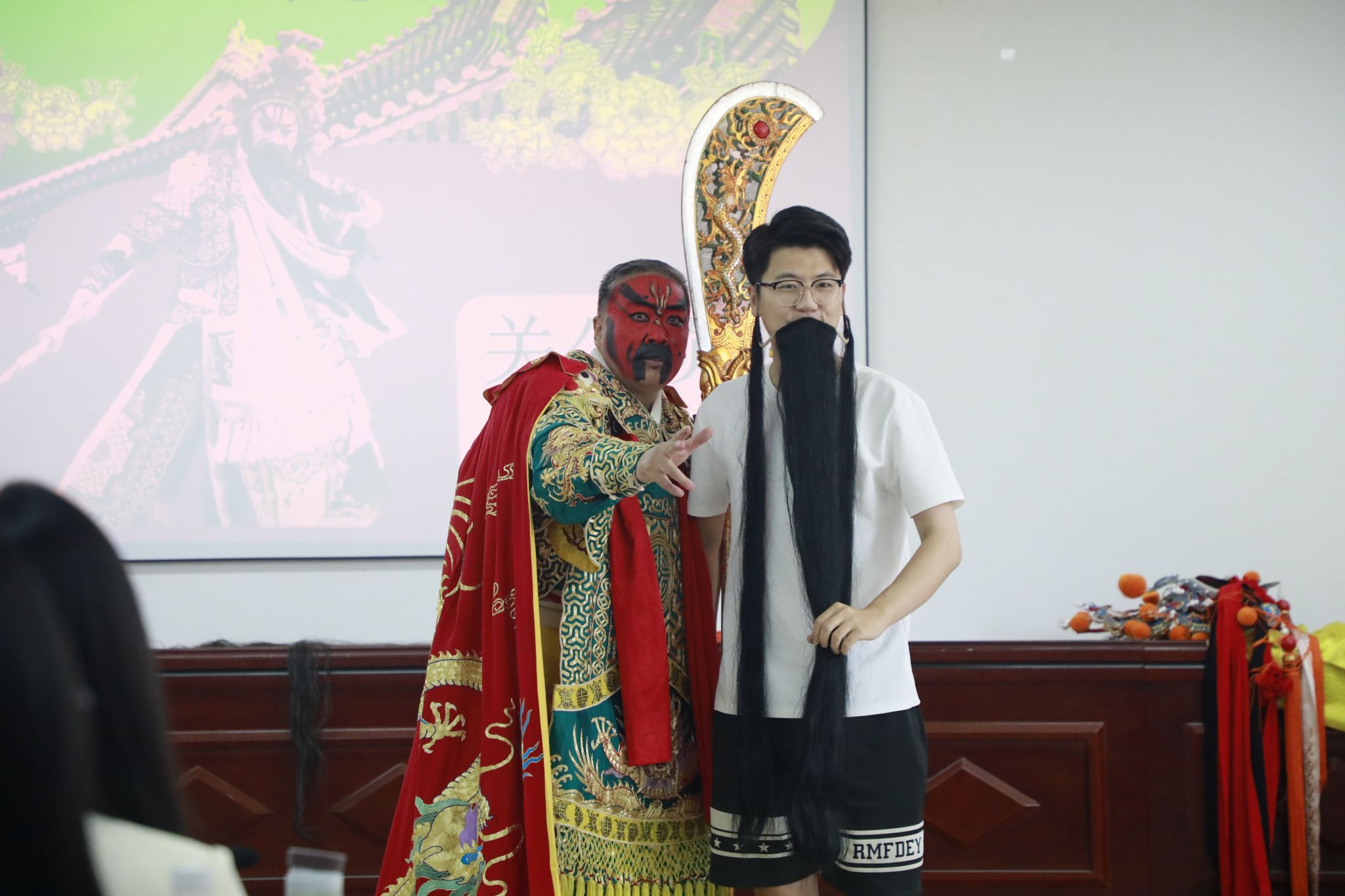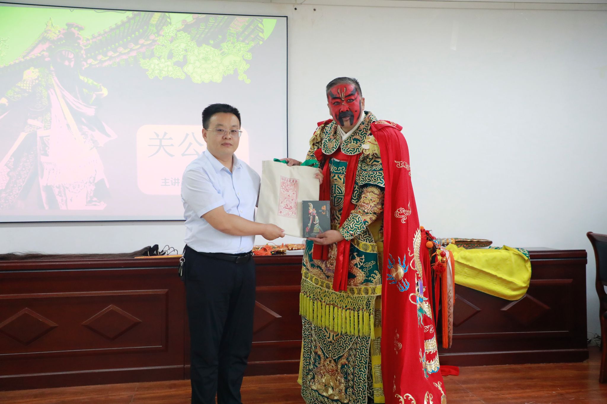 讲座上,师生们首先欣赏了武凌云的表演短片。紧接着武凌云表演了一段《走麦城》中的一段,生动地展现了关羽的英雄形象和忠义精神,给现场师生留下了深刻的印象,受到了现场老师和同学们热烈响应。紧接着,武凌云详细介绍了关羽在戏曲中的服饰、花脸以及专属道具。此外,他还深入阐述了关羽的忠孝仁义,强调关公精神就是忠于国家、忠于民族。同时,他分享了自己赴国外演出的经历,并表示戏曲演员走出国门代表的是中华民族,传播的是中国优秀的传统文化,作为一名扮演关公的戏曲演员,精气神至关重要,而更为关键的是要忠于祖国、热爱祖国。