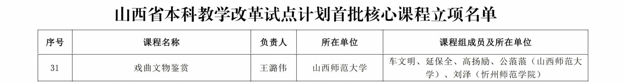 近日,山西省教育厅公布了《山西省教育厅关于公布本科教学改革试点计划首批核心课程立项名单的通知》。经专家评审,公司王潞伟教授团队申报的课程《戏曲文物鉴赏》荣获山西省本科教学改革试点计划首批核心课程立项。