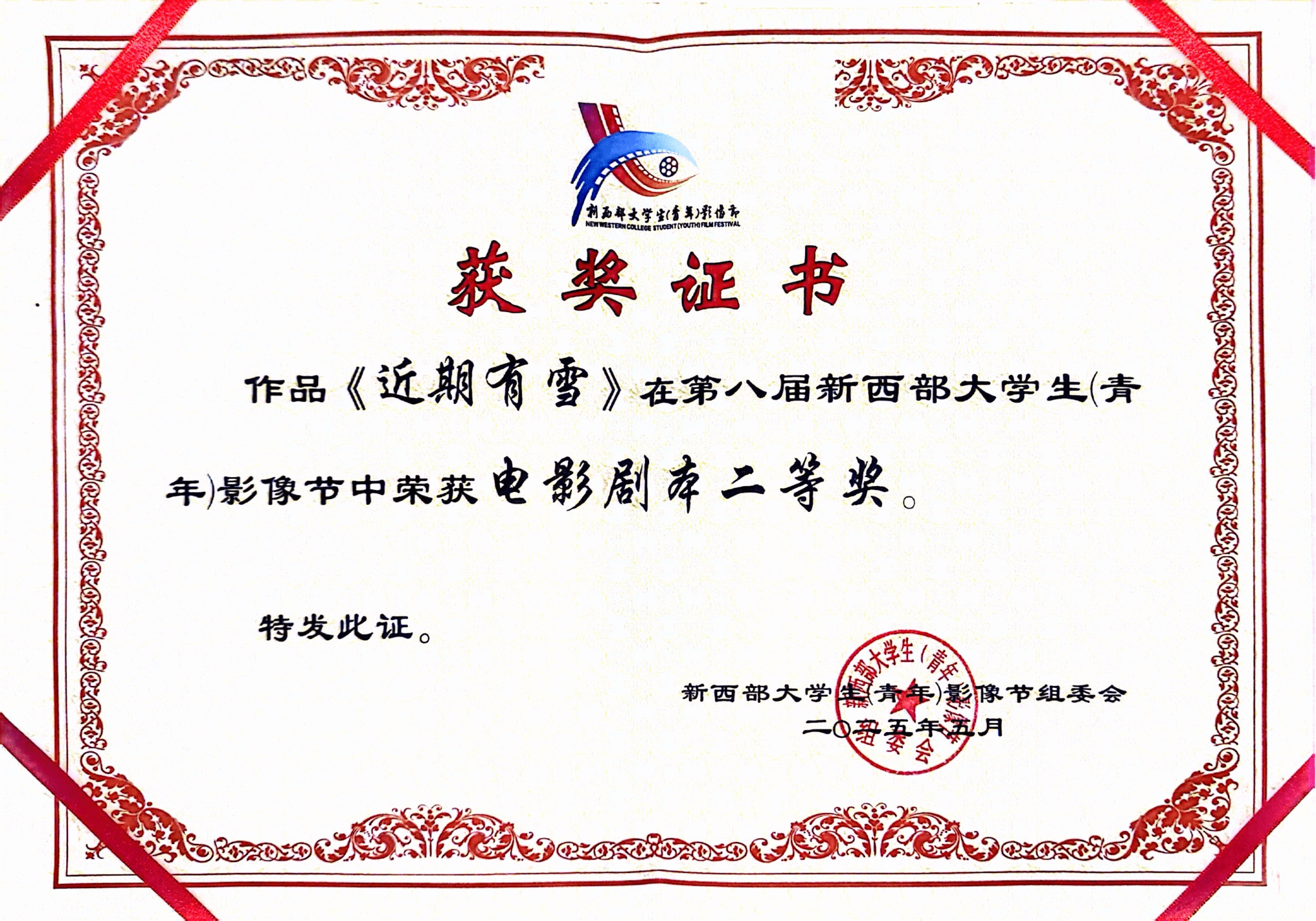 2025年5月17日,第八届新西部老员工(青年)影像节获奖名单正式公布,公司戏剧影视文学专业本科生白杰凭借电影剧本《近期有雪》斩获主竞赛单元—电影剧本类—二等奖。