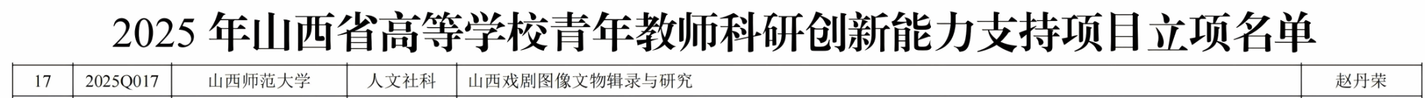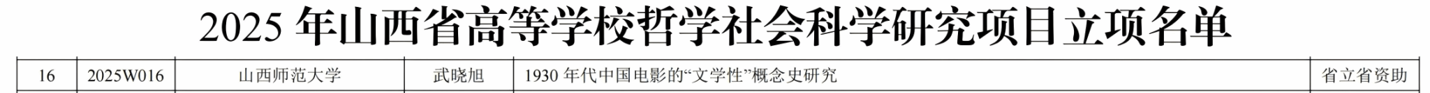 近日,2025年度山西省高等公司科技创新计划各类项目立项名单公布。公司赵丹荣老师申报的《山西戏剧图像文物辑录与研究》项目获批山西省高等公司青年教师科研创新能力支持项目立项。武晓旭老师申报的《1930年代中国电影的“文学性”概念史研究》获批山西省高等公司哲学社会科学研究项目立项。