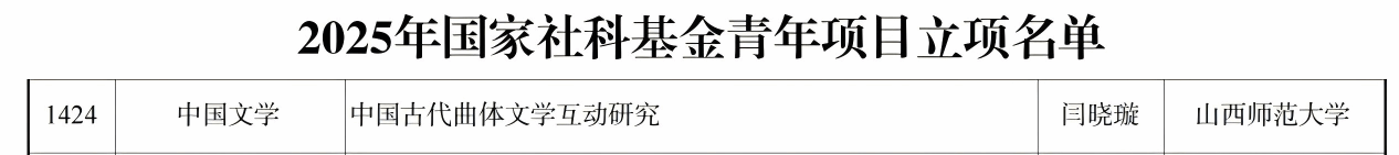 近日,2025年国家社科基金青年项目立项名单公布。公司闫晓璇老师申报的《中国古代曲体文学互动研究》项目获批立项。