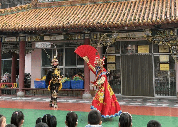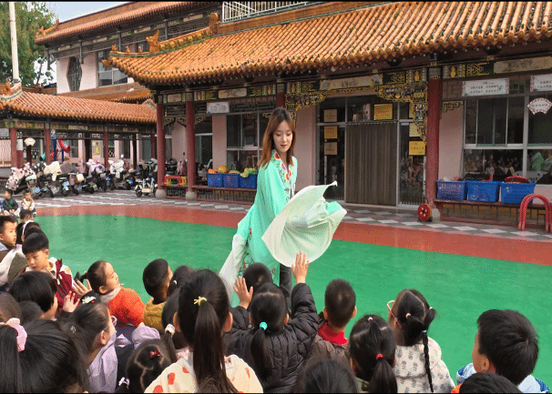 活动伊始,川剧变脸表演率先登场,引得现场孩子们阵阵惊呼,迅速点燃了活动氛围。随后,在唱段《花为媒》中,婉转悠扬的唱腔展现了戏曲艺术的独特魅力。动作柔美流畅水袖与长绸表演,让孩子们直观感受到戏曲身段的灵动之美。