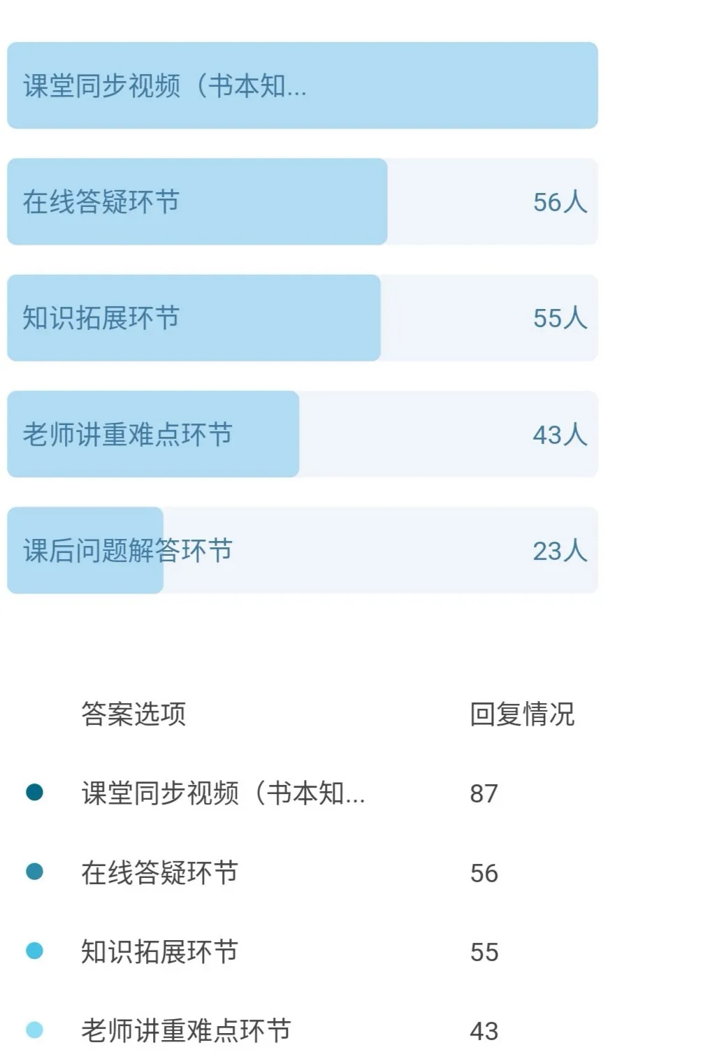 由图可知,这几类选项差别不大,但是在''课后问卷环节''中,同学们不太感兴趣,从里也这可以看出有少部分同学在课后还坚持提问。