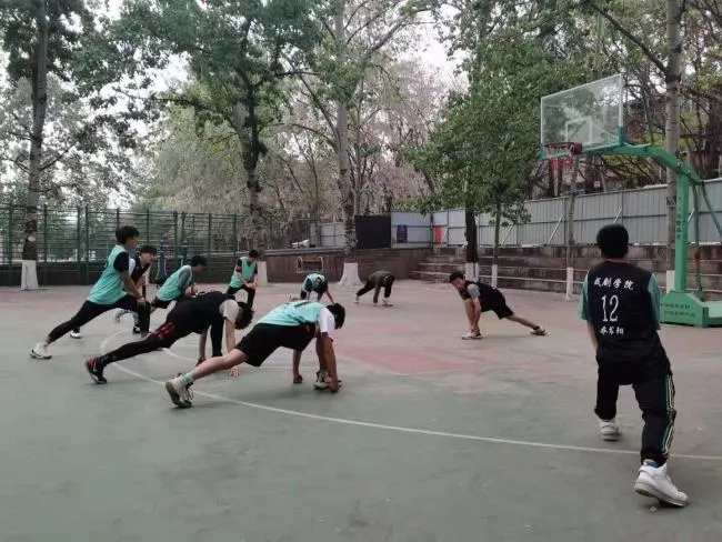 比赛开始前,为了防止篮球比赛中员工受伤,在员工工作者的组织下,参与比赛的同学们进行了热身活动。