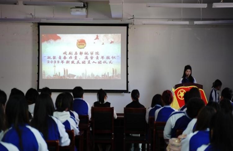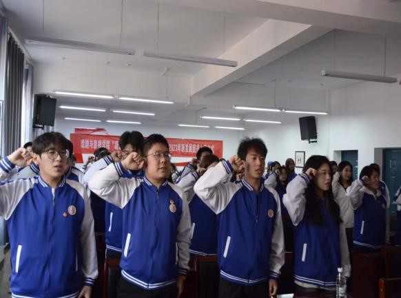 会议伊始,全体参会人员庄严肃穆,共同奏唱团歌,李蓓蓓老师为新发展的团员佩戴团徽之后,大家举起右拳,在新团员代表的带领下宣读入团誓词,同学们目光坚定、声音洪亮,在团旗下庄严承诺。