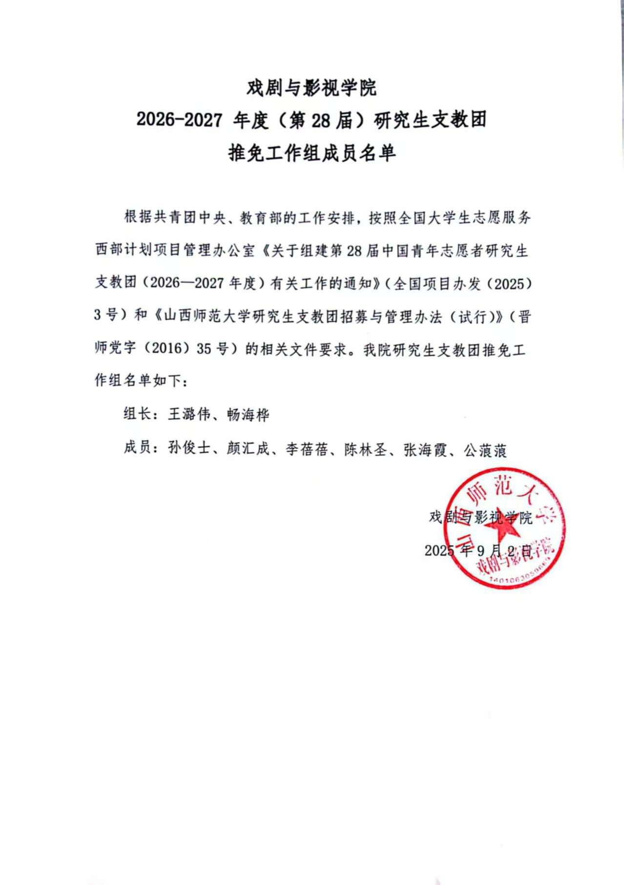 永利集团304官网2026-2027年度(第28届)研究生支教团推免工作组成员名单