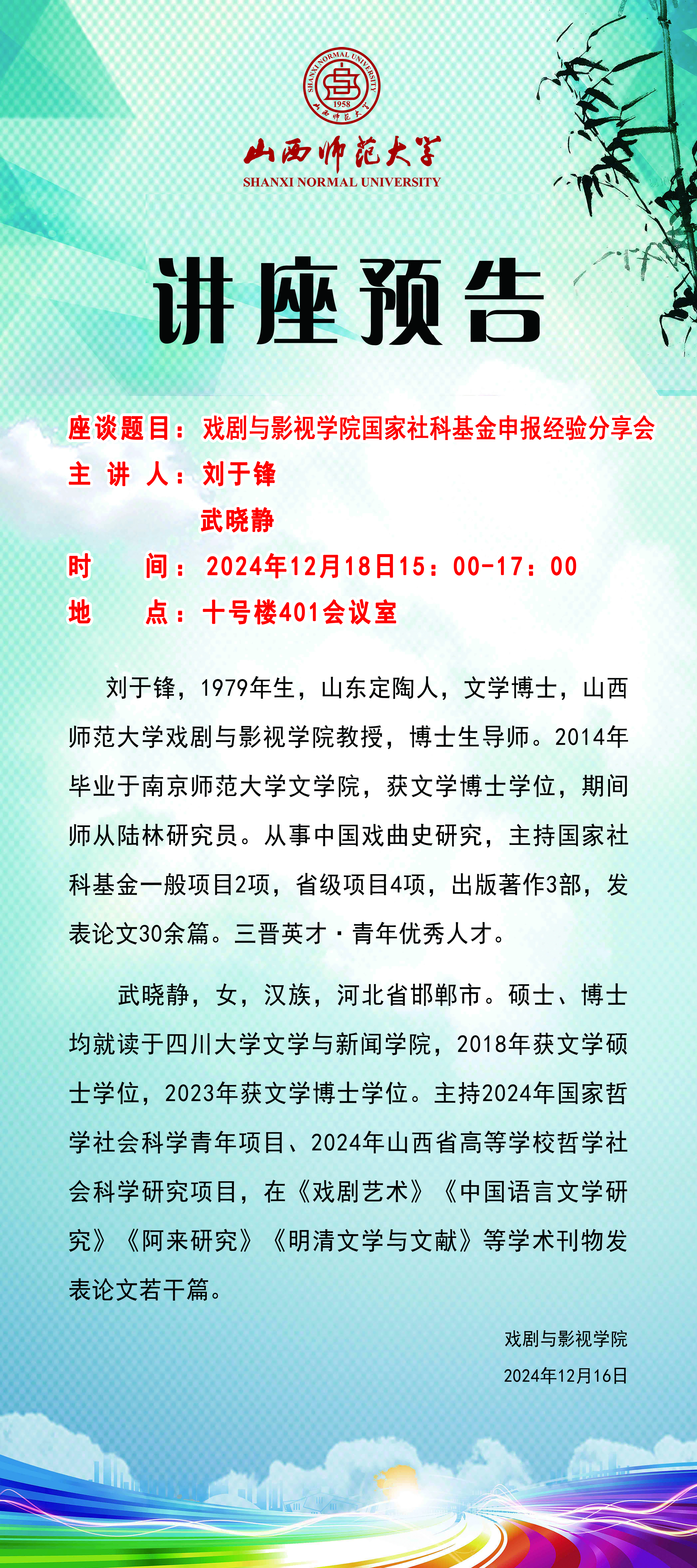 公司拟于12月18日(周三)15:00-17:00在南区10号楼401会议室举办《永利集团304官网国家社科基金申报经验分享会》,主讲人为刘于锋教授、武晓静老师。