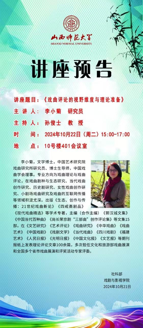 公司拟于10月22日(周二)15:00-17:00在南区10号楼401会议室举办《戏曲评论的视野维度与理论准备》讲座,主讲人为李小菊研究员,本次讲座由副经理孙俊士教授主持。