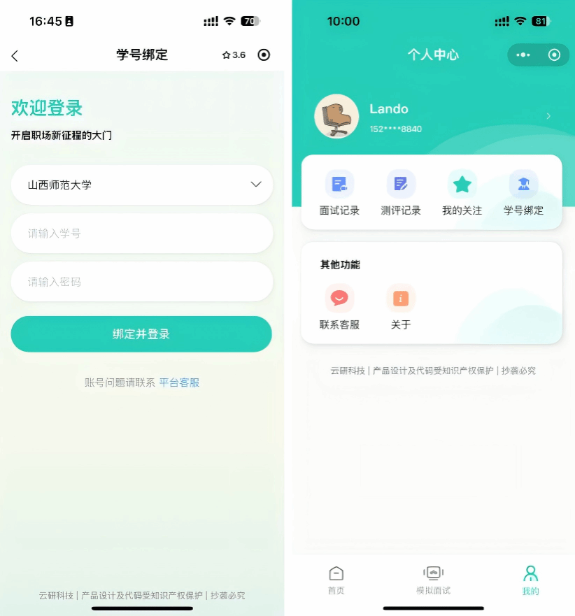3. 进入后点击我的:学号绑定选择“永利304官网”,输入学号、密码为身份号后六位,绑定并登录,你的个性化面试之旅即将开启!